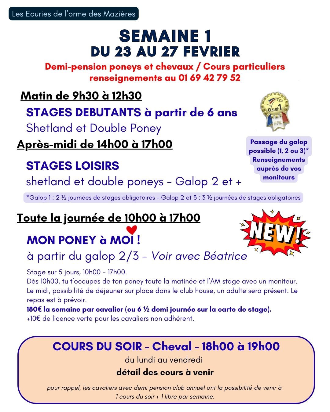 Pendant les vacances scolaires et la période estivale Juillet et Août, les écuries organisent des stages d'équitation ouverts à tous, adhérents et non adhérents.